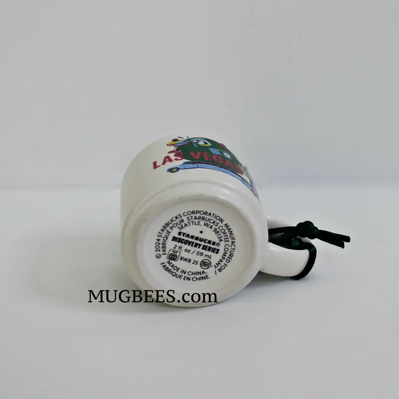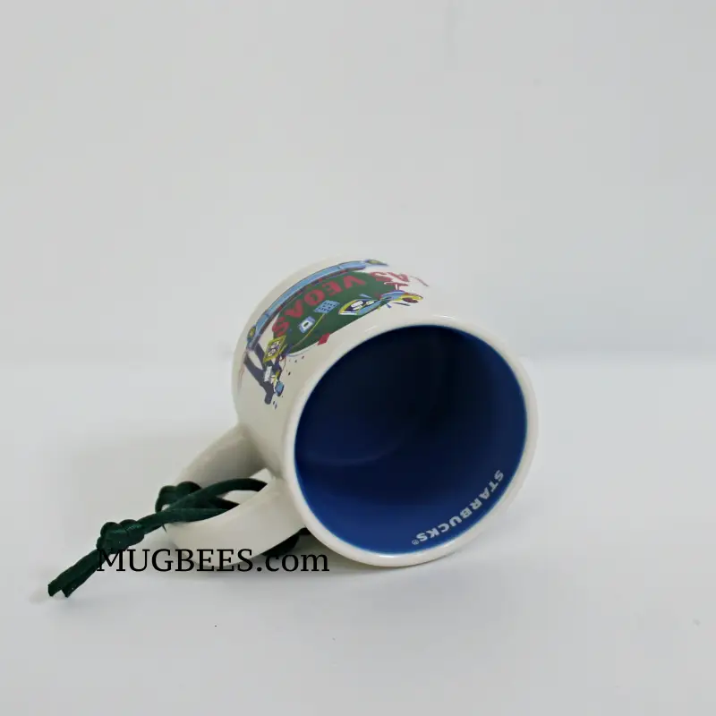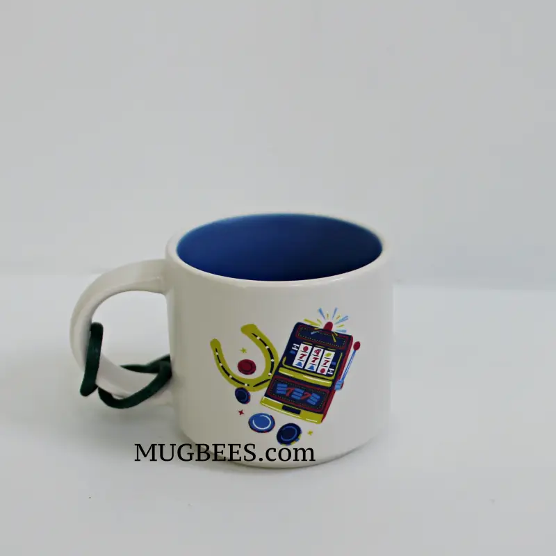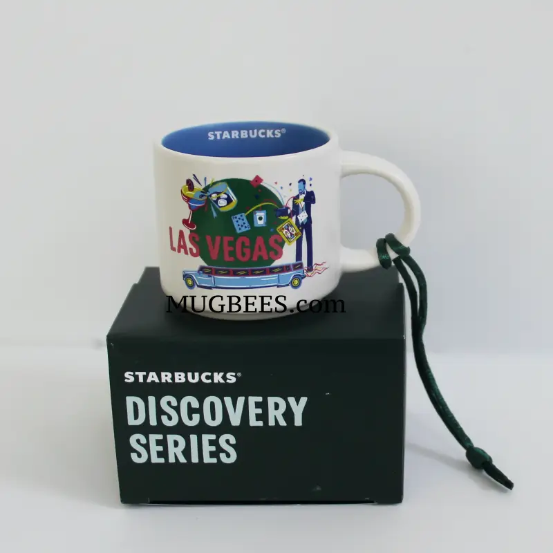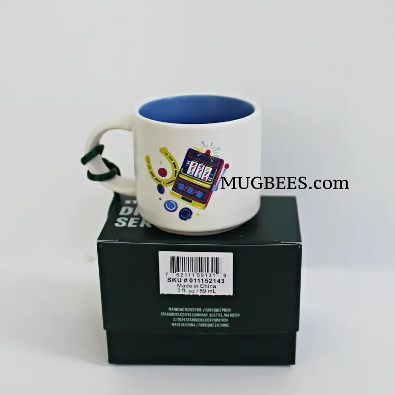 Art on mug features casino and gambling symbols, and entertainment characters of the sin city.